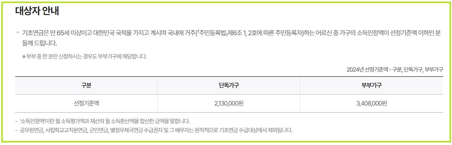 연금 대상이 되기 위해서는 이 소득인정액이 일정 금액 이하여야 하는데, 2024년 7월 현재, 단독가구일 경우 월 213만 원, 부부 가구일 경우 월 340만 8000원 이하일 경우 받을 수 있습니다.